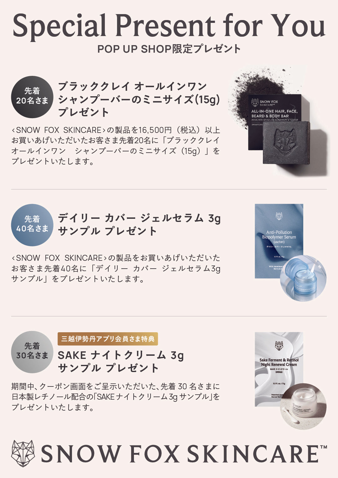 SNOW FOX SKINCAREの製品をお買いあげいただいた先着40名さま限定