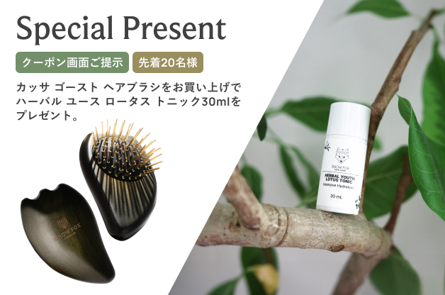 「プレミアム FOX カッサ ゴースト ヘアブラシ」をお買い上げの先着20名様にハーバル ユース ロータス トニック ミニボトル(30ml)をプレゼントいたします。