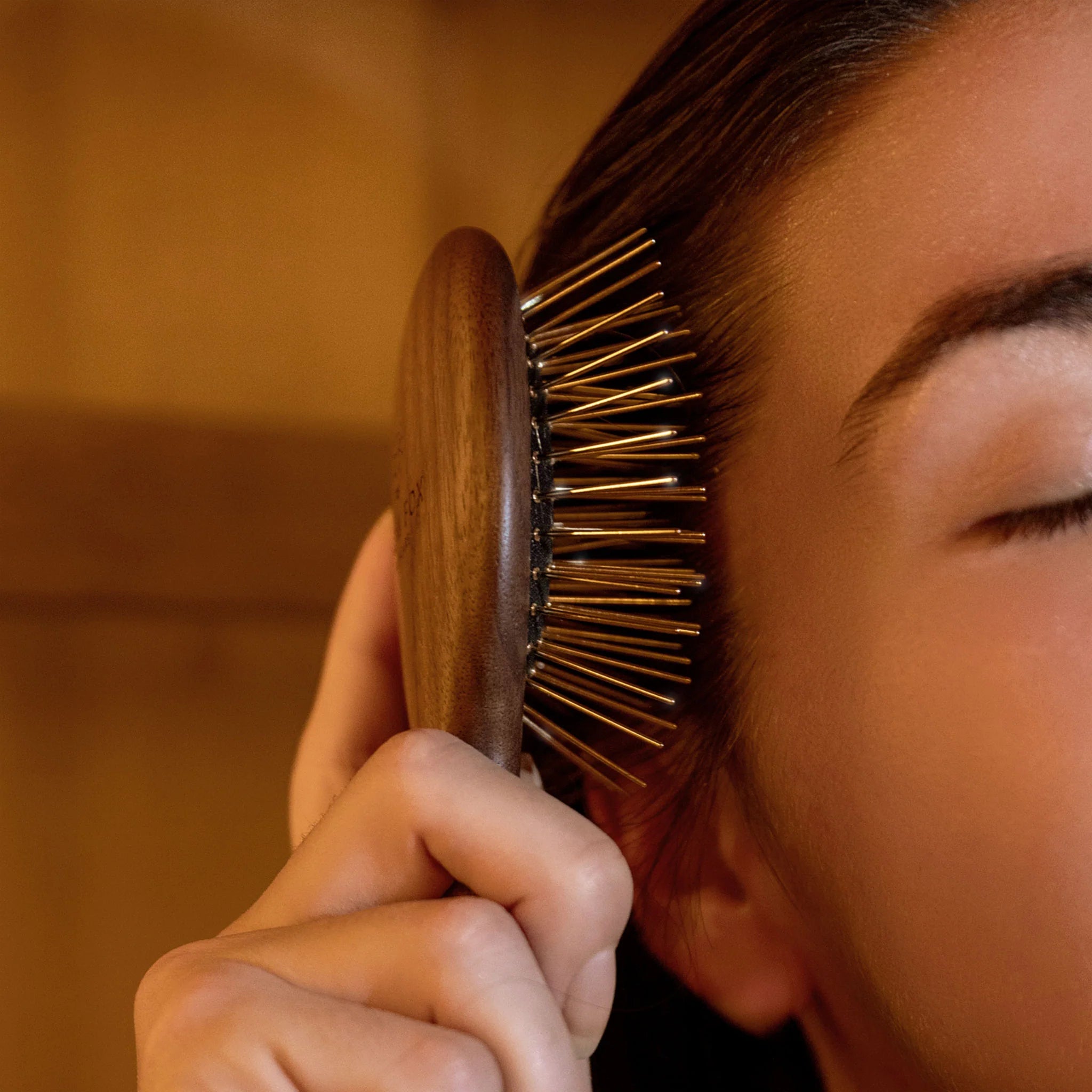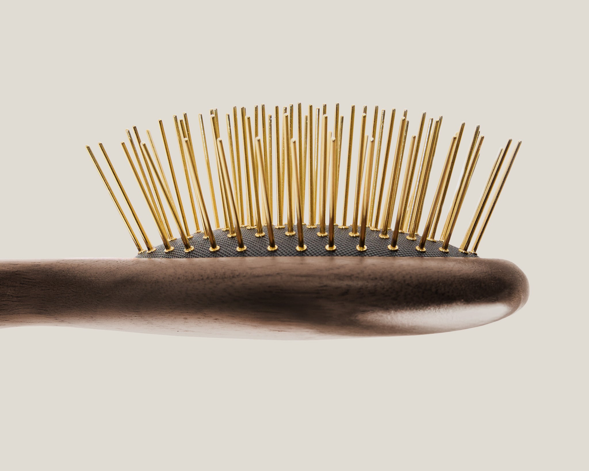毛台(ラバー)には、遠赤外線を放射するセラミックスを高密度配合。自然由来の温熱効果を生み出し、ブラッシング時の頭皮を心地よくケアします。さらに、ブラシピン表面には高い熱伝導性を持つ24Kゴールドメッキを施し、発生した温かさを逃さずダイレクトに頭皮へ伝達。
