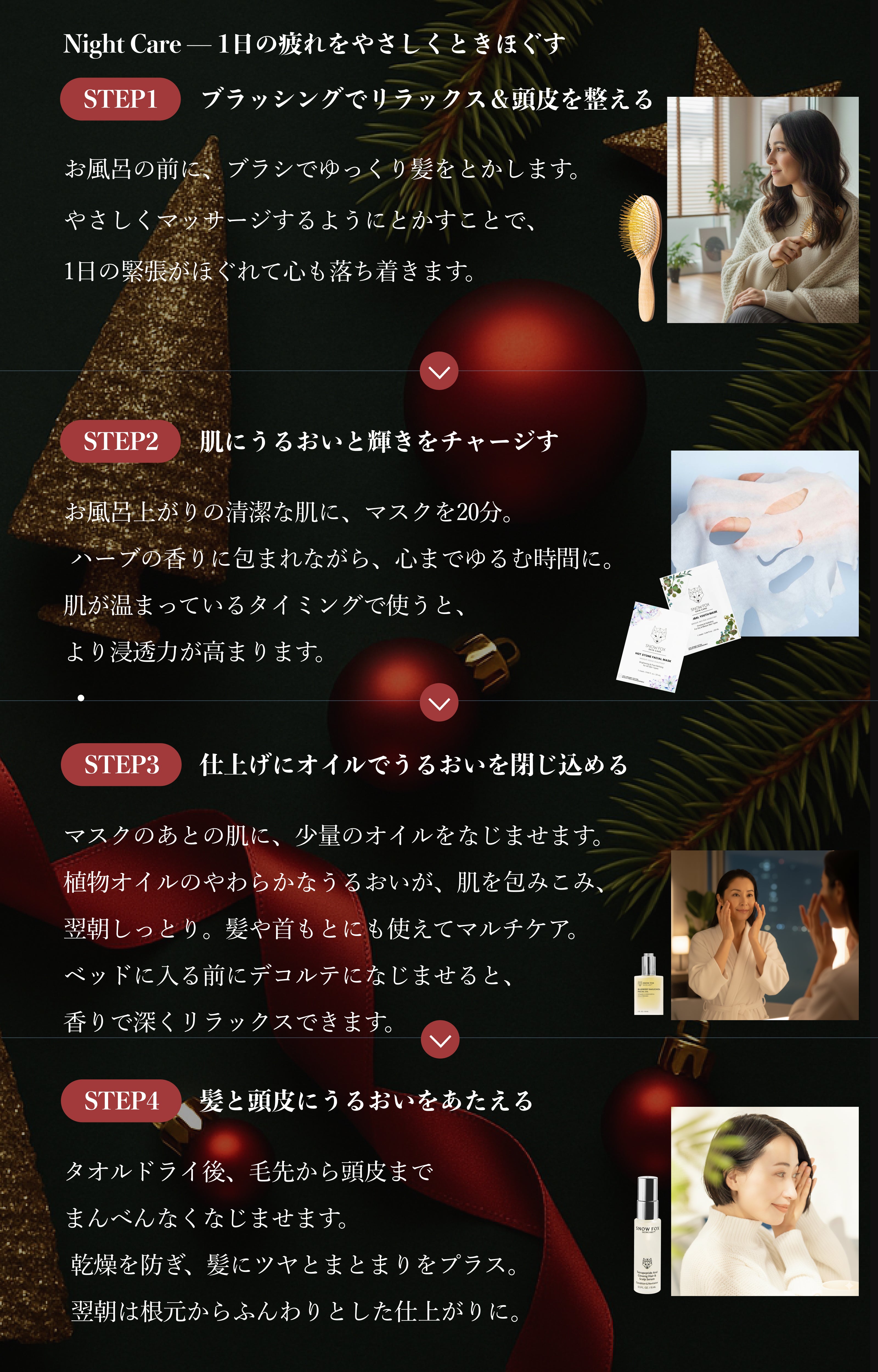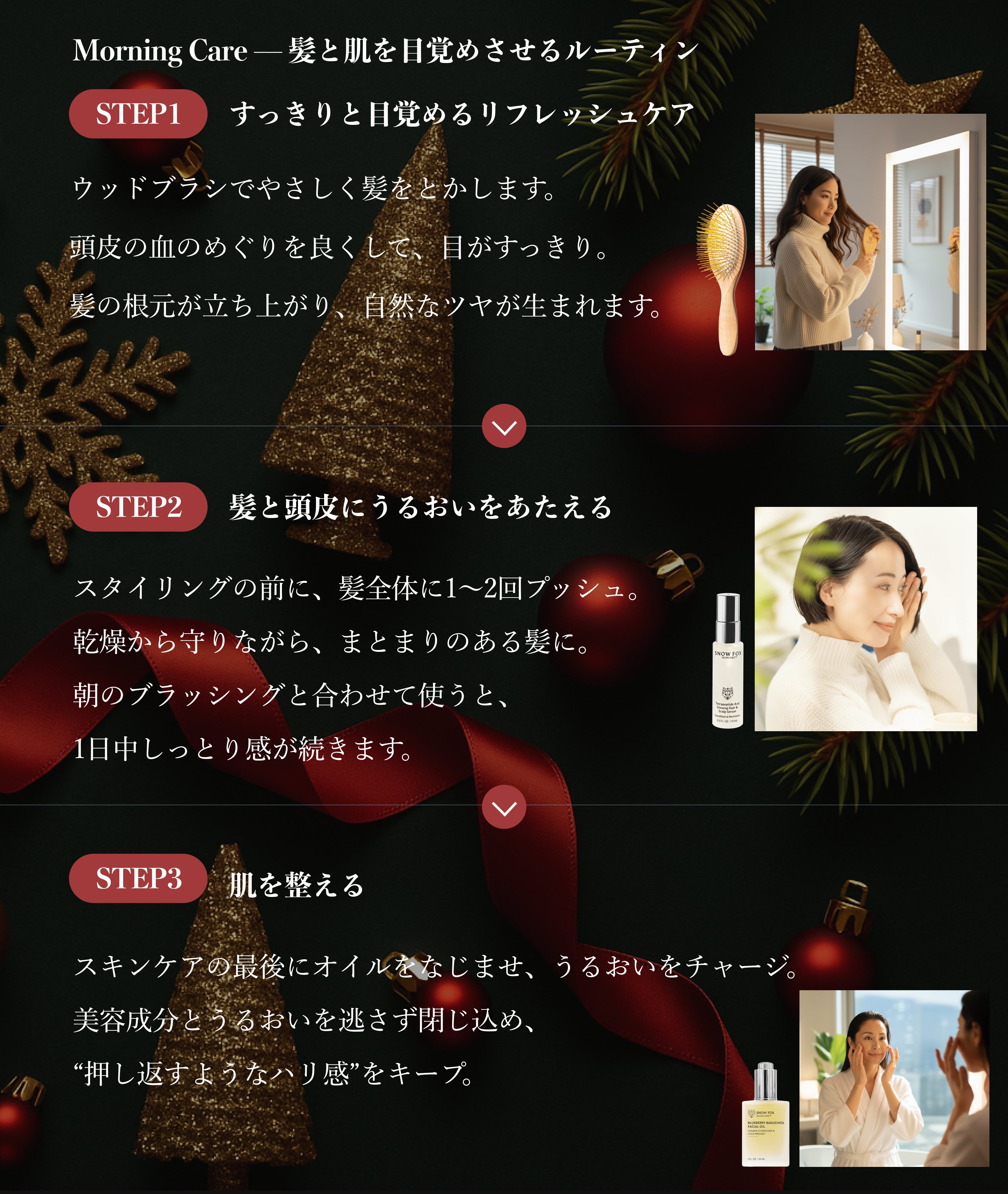 頭皮も肌も、自然と整う。朝も夜も、心地よくめぐるケア。