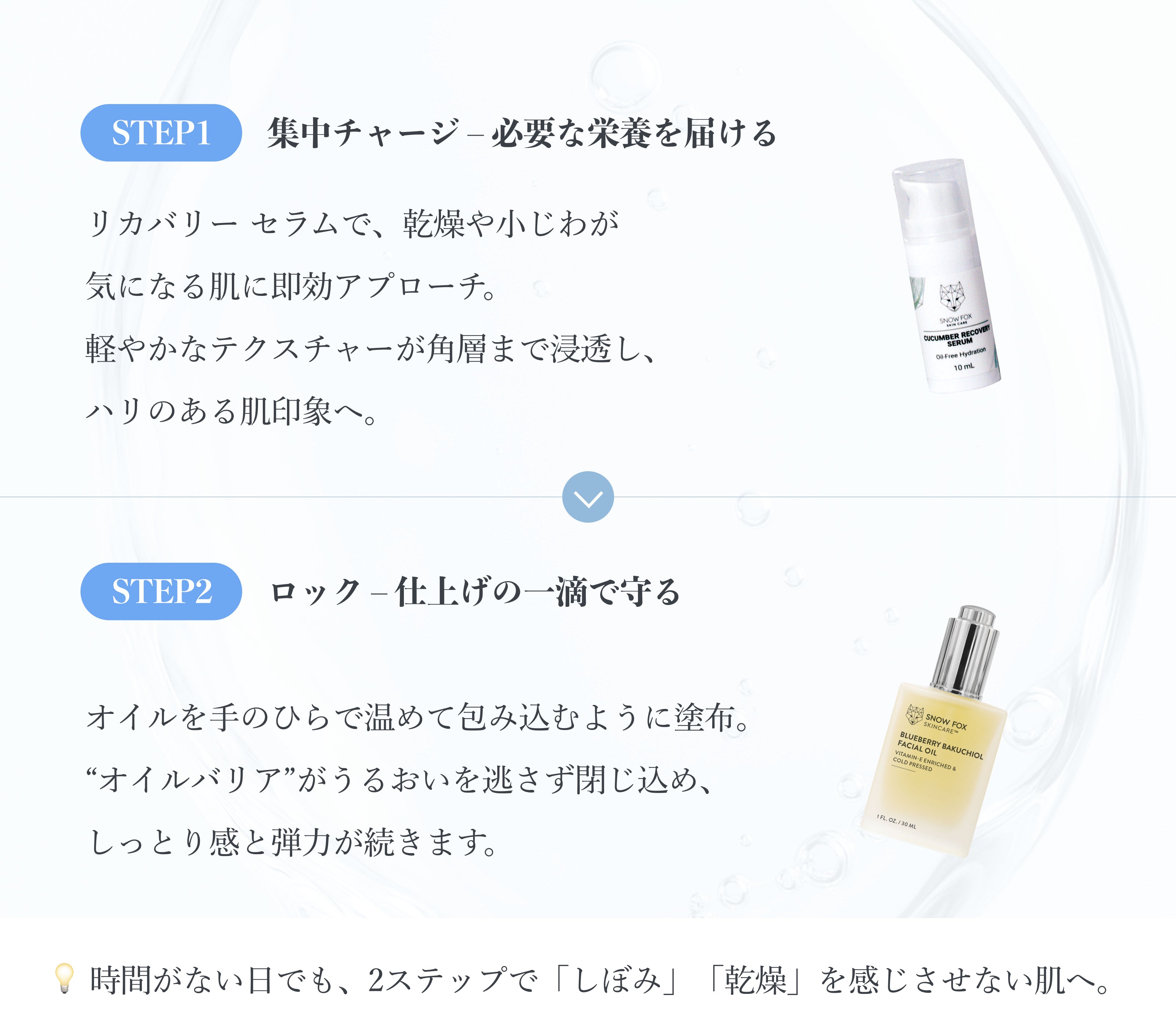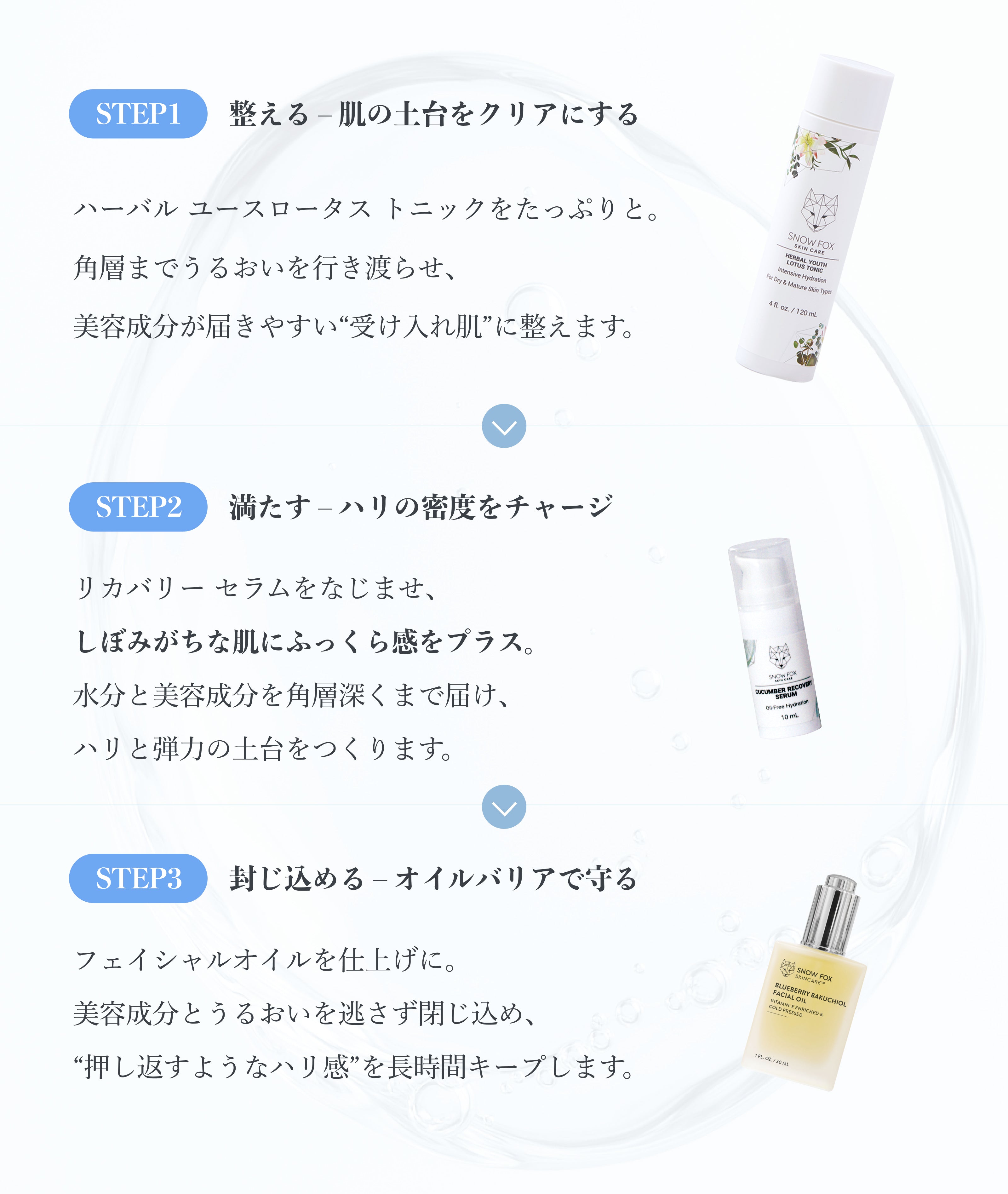 SNOW FOX SKINCAREの製品は肌状態の段階に応じてレイヤーで肌を育てます。