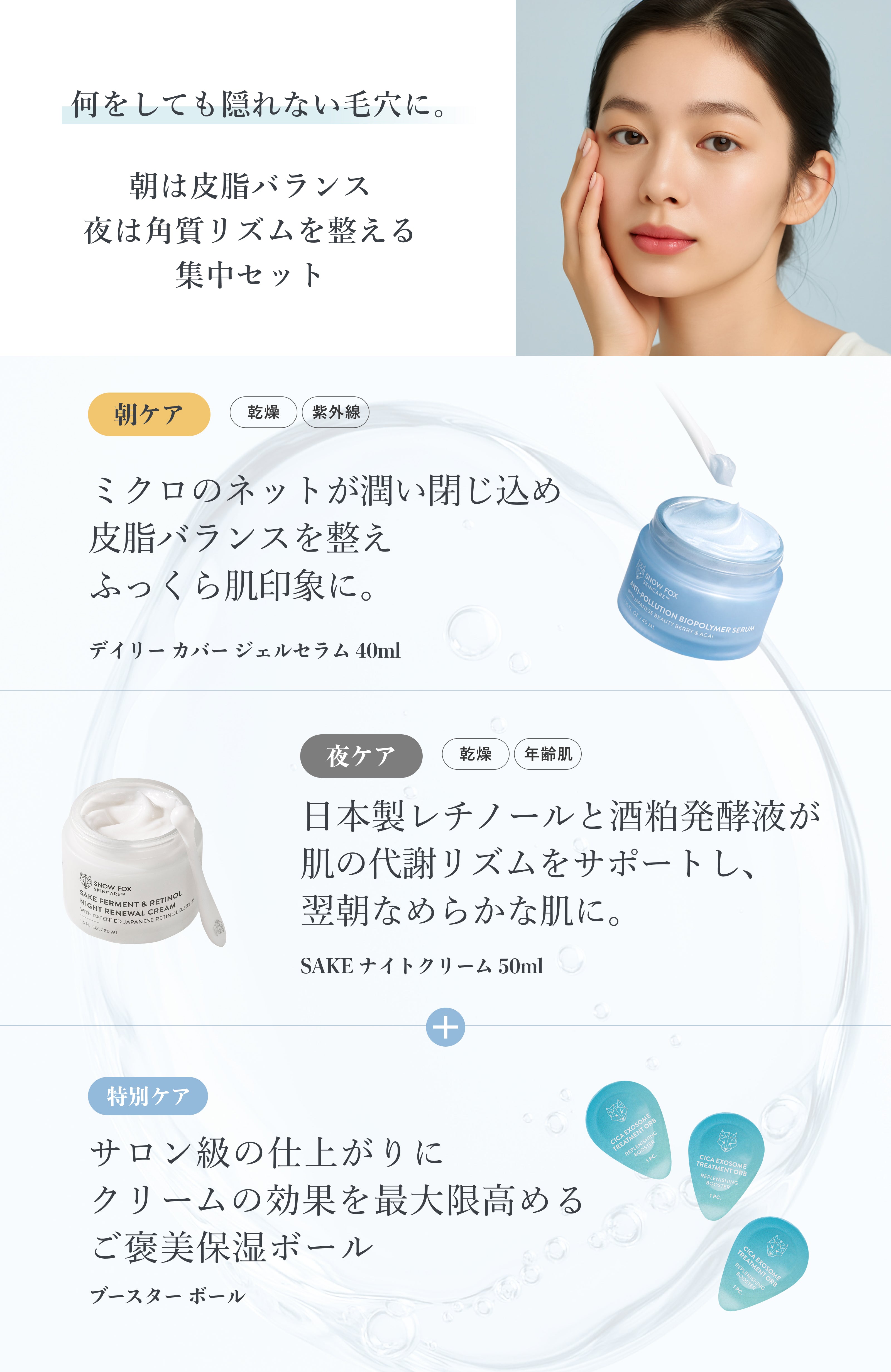 皮脂バランスと肌のキメを整え、なめらかな印象へ。