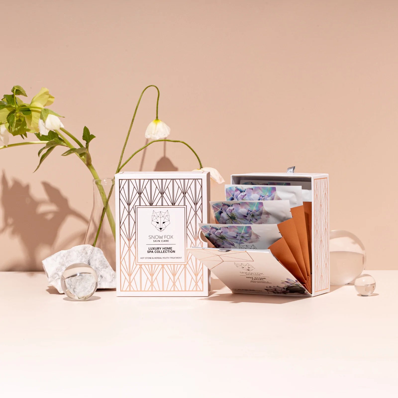ホットストーン マスクとハーバル ユース マスクの高機能シートマスクを5枚ずつ折りたたみ式のボックスに入れた、まるで宝石箱のようなシートマスクのセットです。